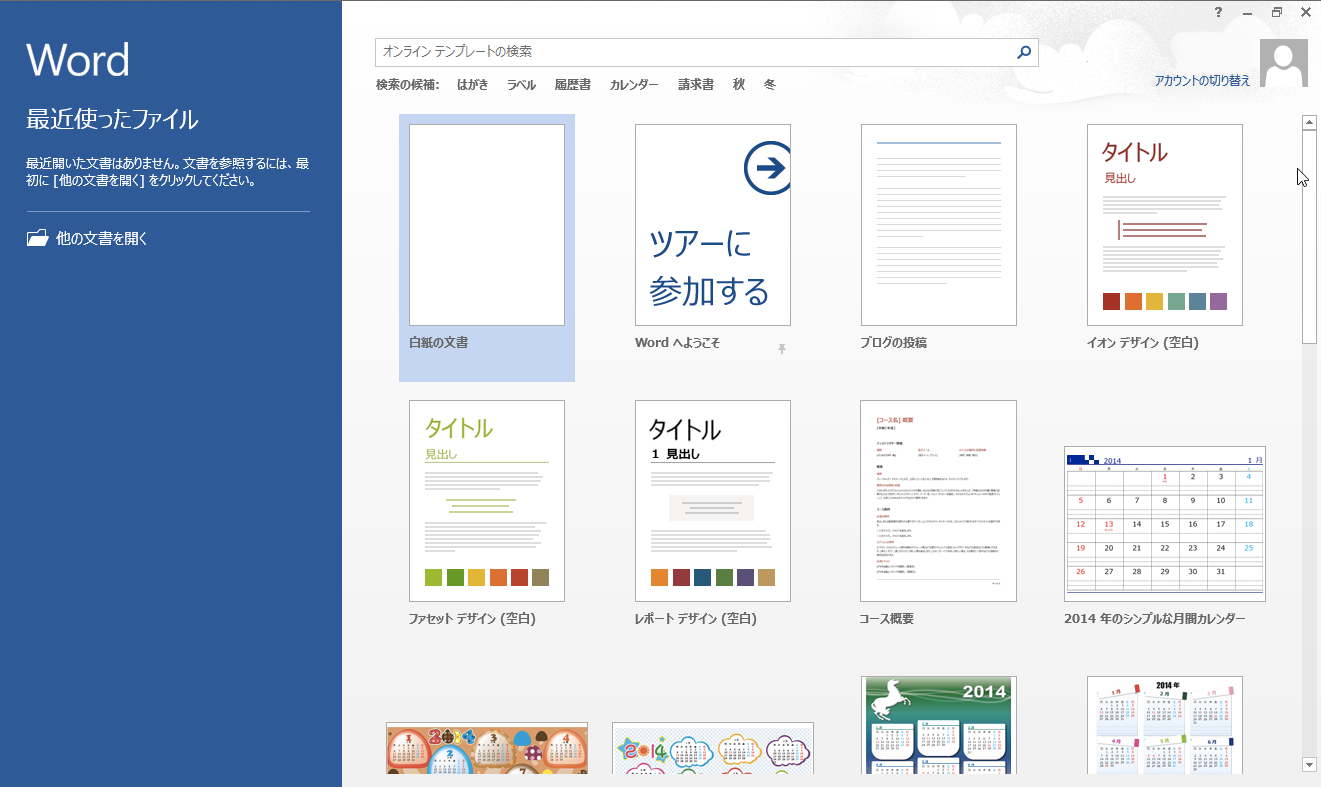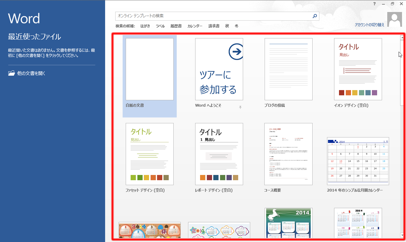 起動した画面(下図)の赤枠で囲ったところから目的にあうテンプレートがあればそれを、無ければ「白紙の文書」を選択してクリックします。