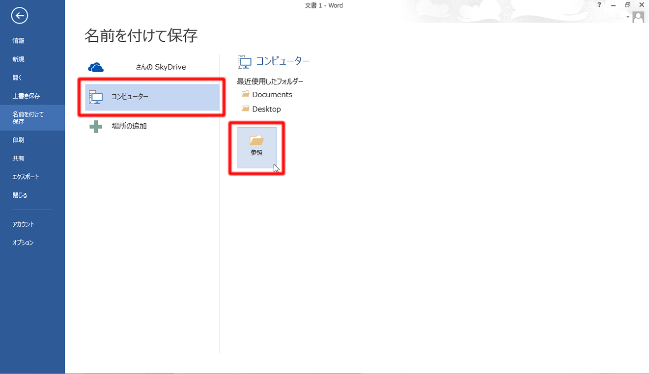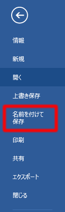 「開く」が選択された状態になっていますので、左の青い帯のメニューから「名前をつけて保存」を選択します。