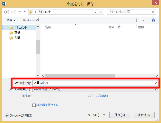文書が完成したとき、または作業を終わるときに保存してもよいのですが、不測の事態に備えて最初に名前をつけて保存し、こまめに上書き保存しましょう。